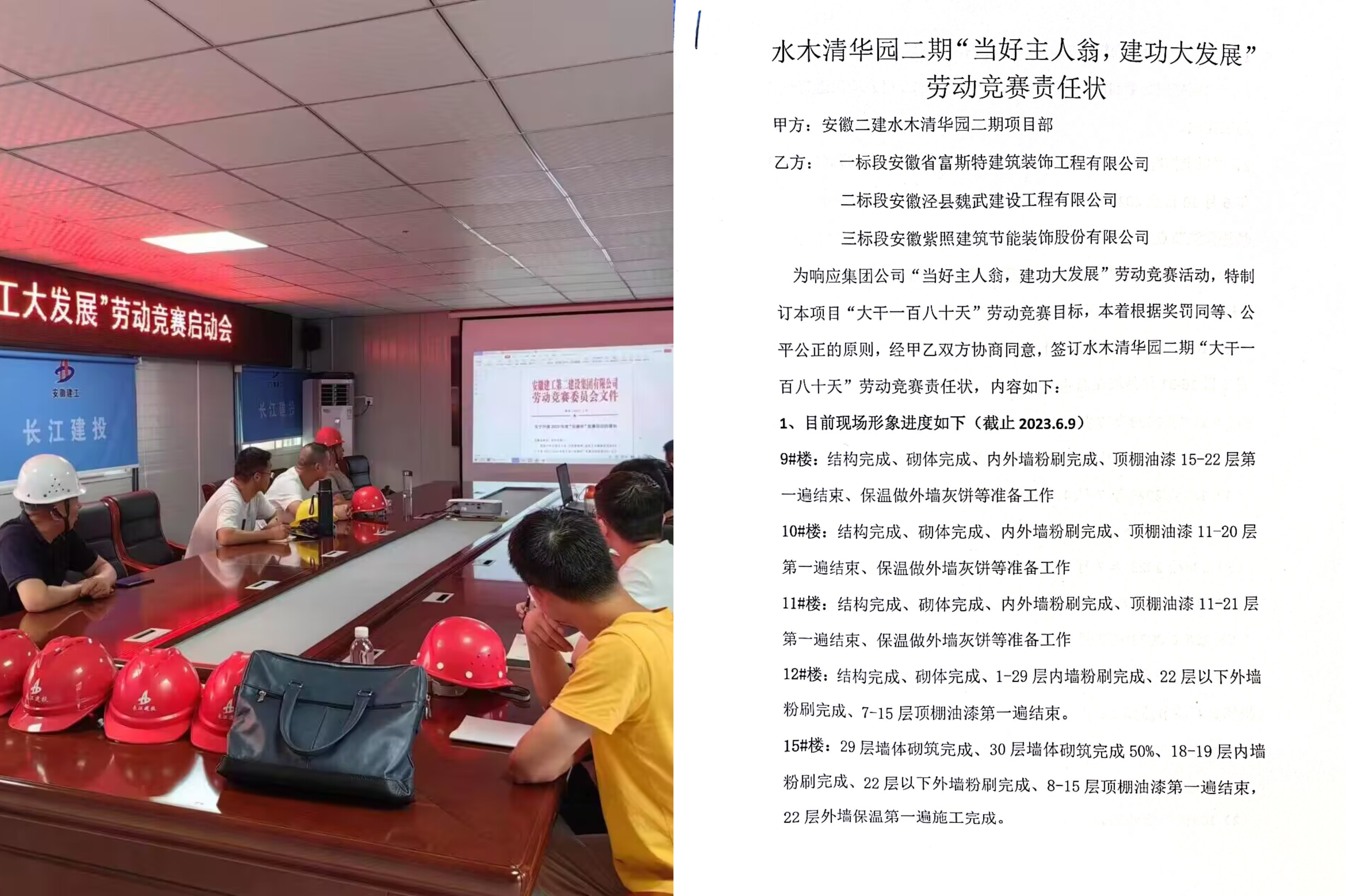 为积极响应公司“当好主人翁 建功大发展”劳动竞赛号召,铜陵水木清华园二期项目部以“项目基础管理年”活动为抓手,聚焦全年生产目标任务;以劳动精神为引领,下好先手棋,打好主动仗;以提质增效、价值创造为重点,不断提升全员劳动生产率,形成比学赶超的浓厚氛围,为完成劳动竞赛目标任务奠定坚实基础。