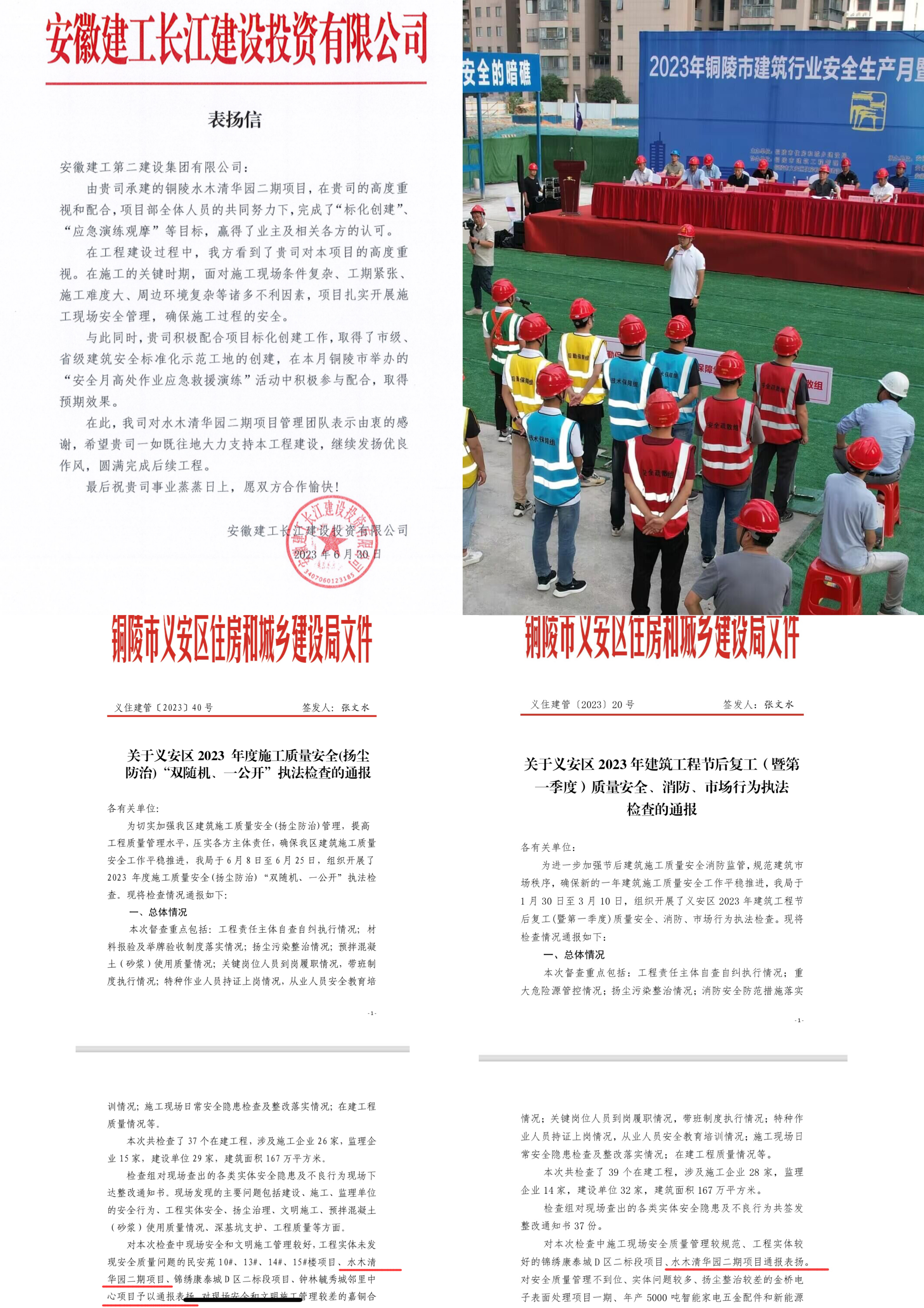 项目自开工以来先后创建了安徽省及铜陵市“建筑安全生产标准化示范工地”、集团和公司两级“党员先锋号”“工人先锋号”“青年文明号”工程。项目部在义安区住建局2023年一季度、二季度检查中被连续通报表扬,并顺利承办了2023年铜陵市建筑行业安全生产月暨高处作业应急救援演练活动,受到属地主管部门的一致好评。