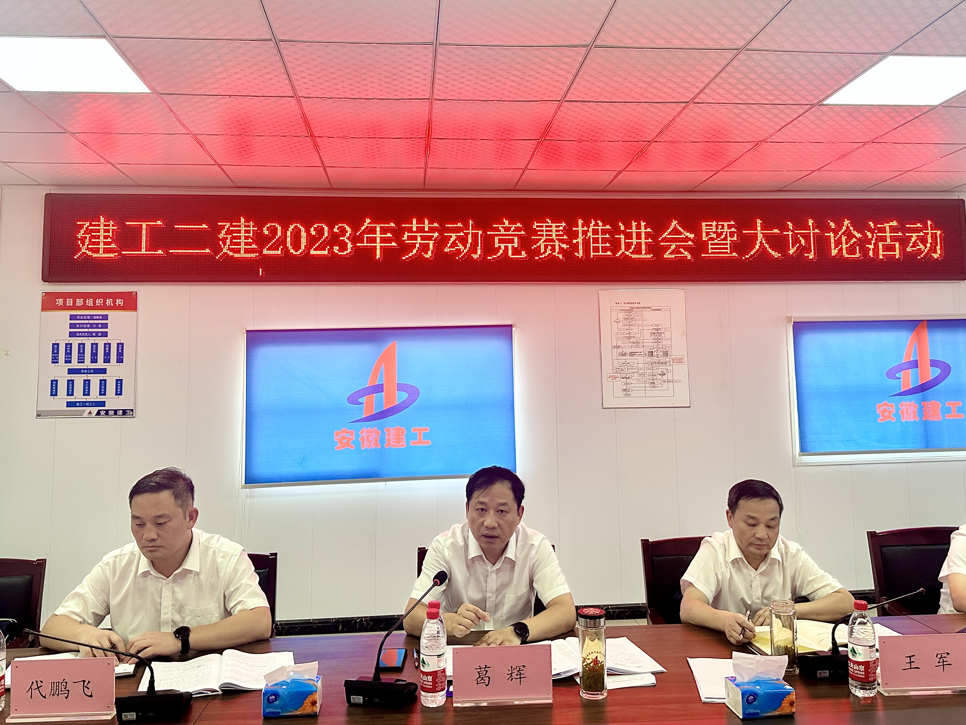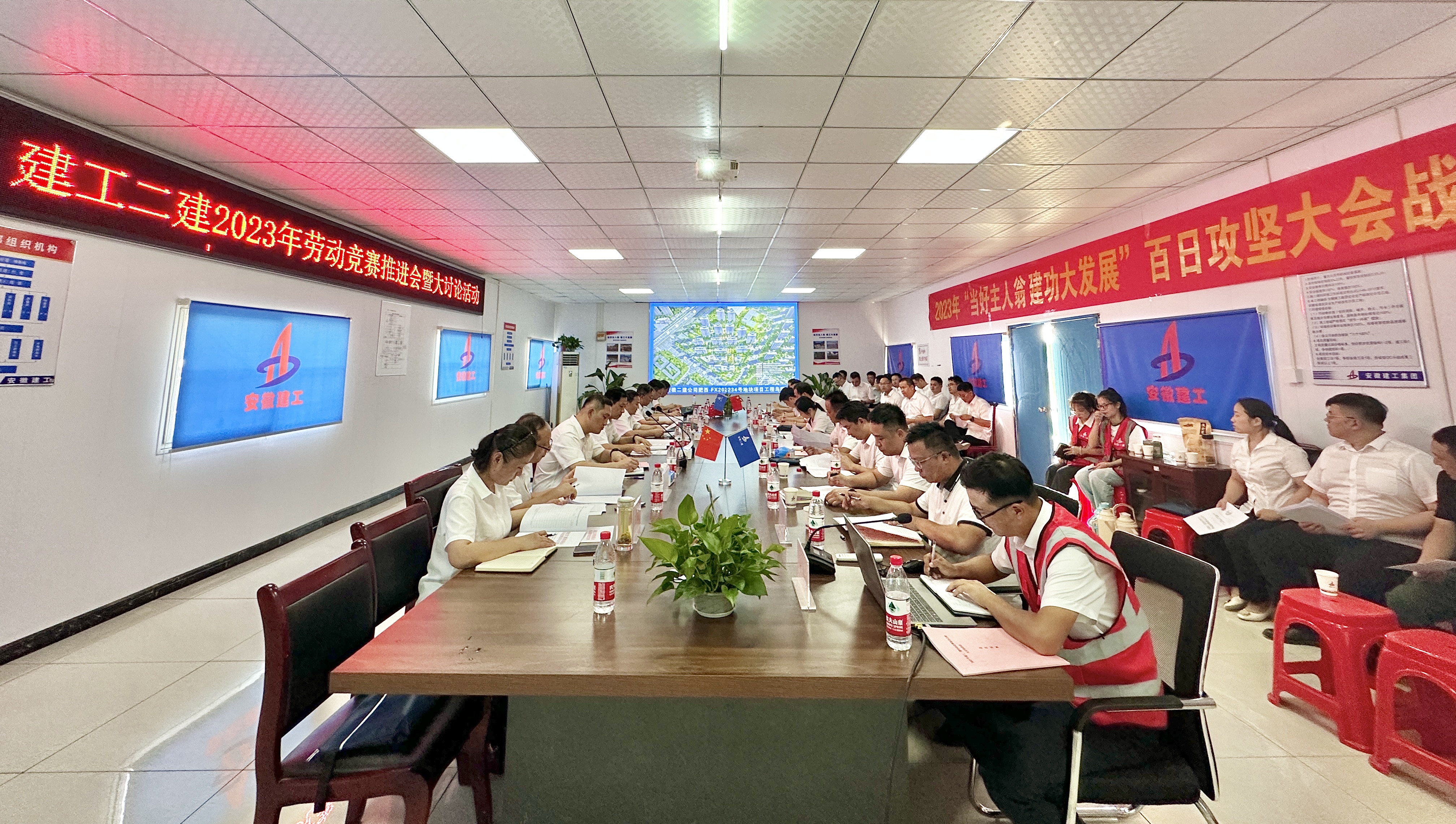 9月18日下午,建工二建在肥西FX202234#地块项目召开2023年劳动竞赛推进会暨开展大讨论活动。公司党委副书记、总经理葛辉出席活动并作总结讲话,党委副书记、工会主席王军主持会议,副总经理代鹏飞参加会议。
