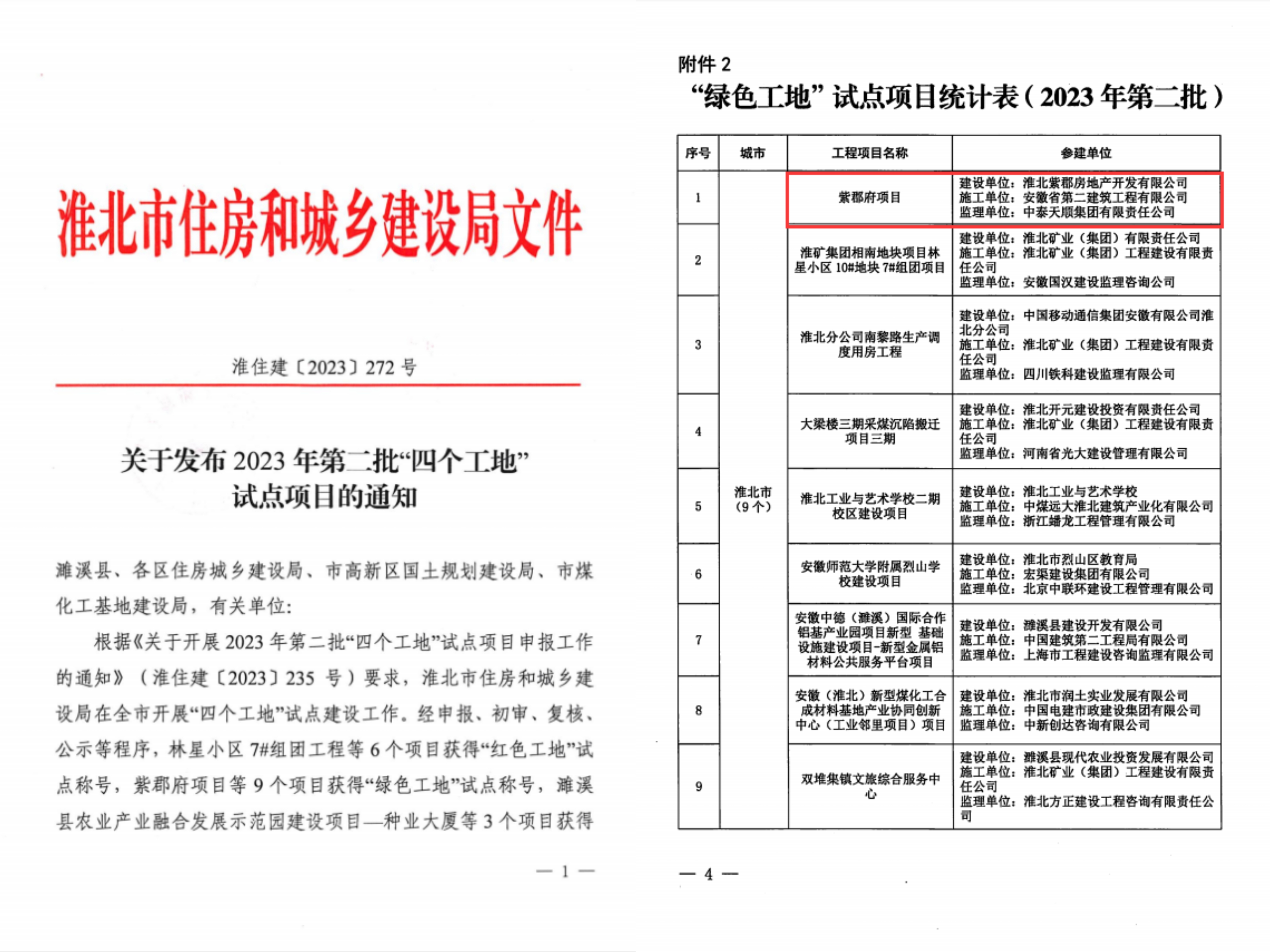 近日,淮北市住房和城乡建设局发布了2023年第二批“四个工地”试点项目名单,建工二建第一公司承建的紫郡府项目荣获淮北市第二批“绿色工地”试点项目称号。