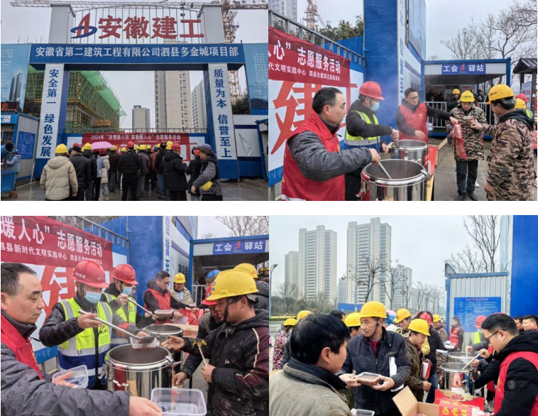 1月18日,第一公司泗县多金城项目部联合主管部门开展了“浓情腊八节 粥香暖人心”公益志愿服务活动,项目部连续三年开展此类公益活动,每年的腊八前夕项目管理人员都会提前准备糯米、小米、红豆、莲子等制作食材,用两个多小时精心熬制两大桶热腾腾的腊八粥,为坚守在岗位上的工人送上温暖和关怀。