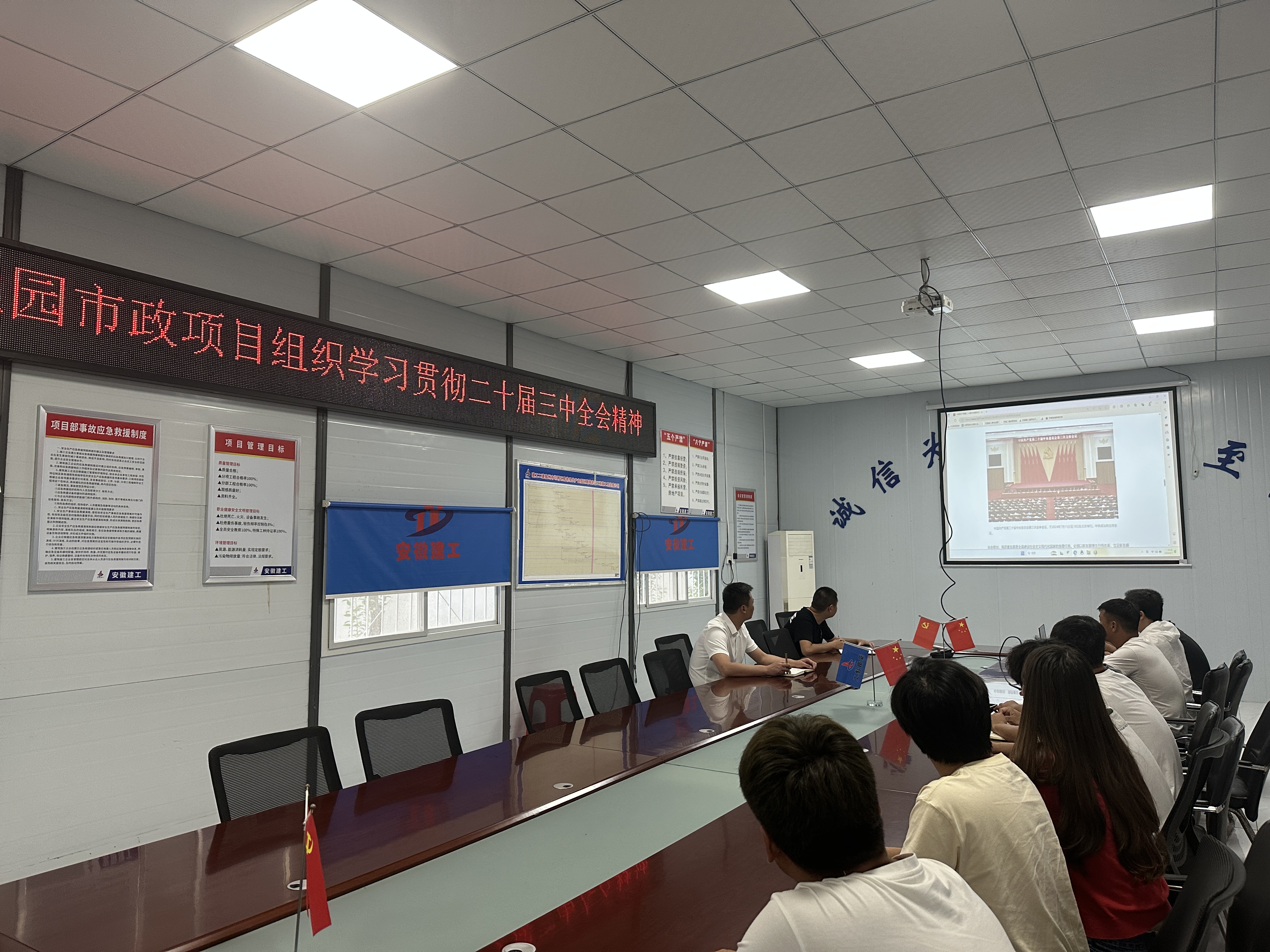 8月7日宿徐现代产业园市政项目组织学习贯彻党的二十届三中全会精神。会上传达学习了《中共中央关于进一步全面深化改革 推进中国式现代化的决定》《党的二十届三中全会精神解读》等文件,并联系工作实际开展学习研讨。