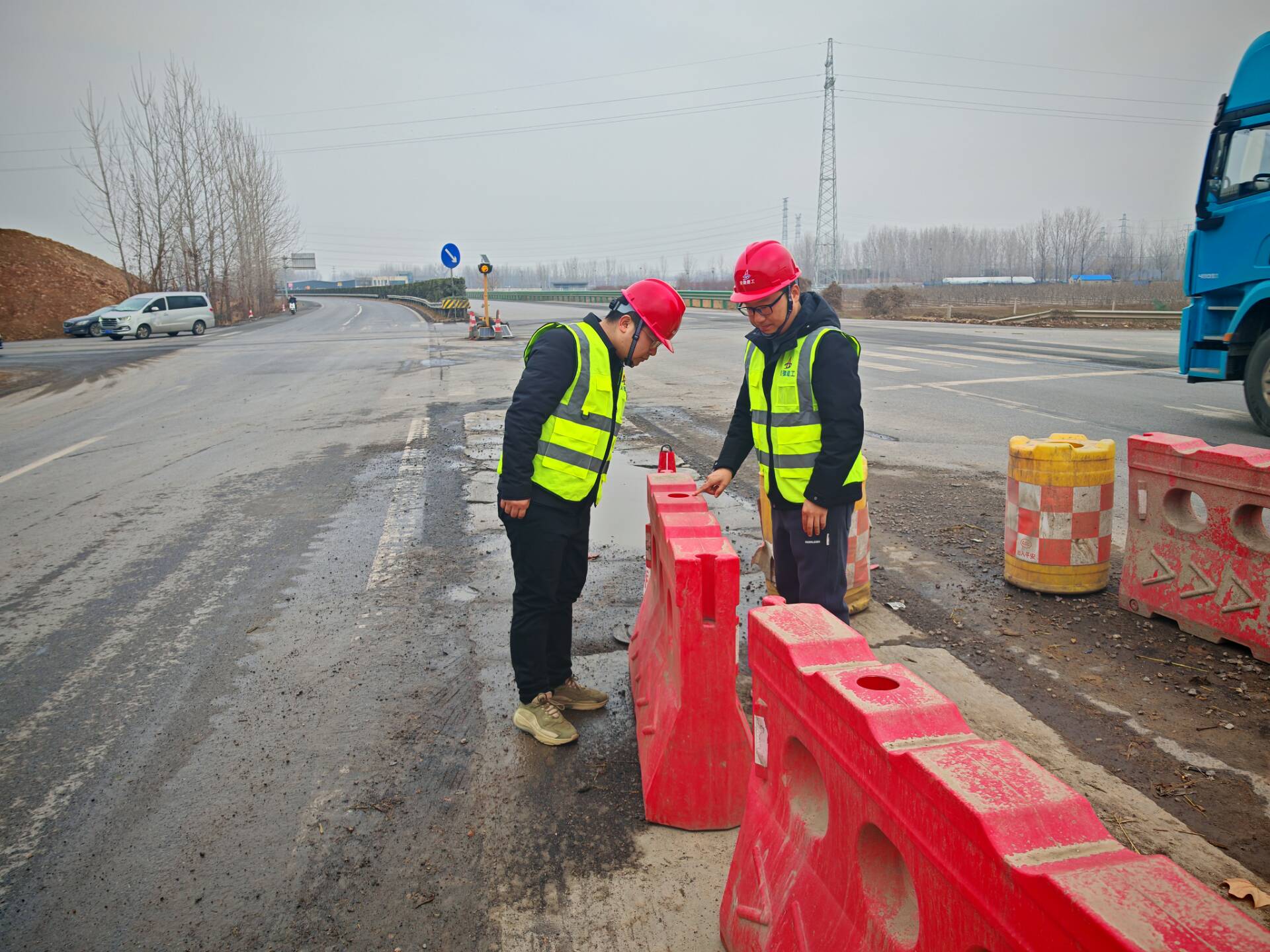 徐淮阜交安机电绿化工程项目技术负责人张楠楠和核算员郑全胜正在进行涉路道口安全检查