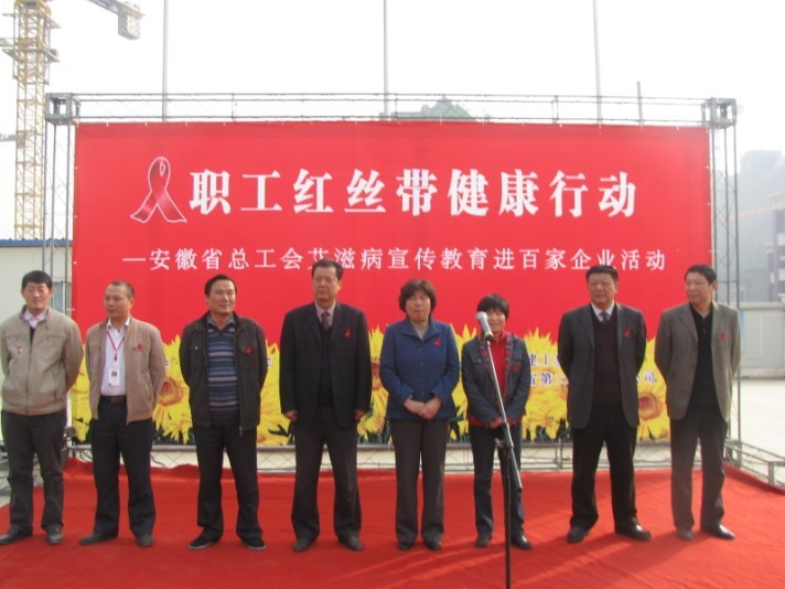 2010年11月24日上午,第23个“世界艾滋病日”即将来临之际,由安徽省总工会、省建工集团开展的“职工红丝带健康防艾宣传进百家企业活动”在省二建天下锦城二期项目部举行启动仪式,省总工会厅级巡视员、省女职工委主任牛和桂,省建工集团工会副主席李鹏飞,工会女职工委主任胡爱红,省二建党委书记朱治淮、工会主席李林等出席了启动仪式。该项目部百余农民工表示,今后要积极主动地加入到预防和控制艾滋病的行动中来,为遏制艾滋病在我省流行蔓延尽到应有的贡献。