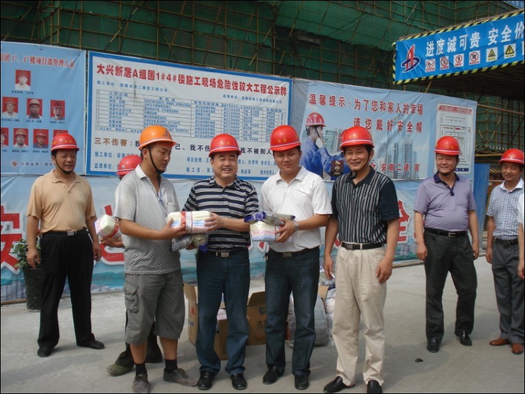 7月17日上午,集团公司党委书记、董事长胡运成,工会主席、纪委书记牛曙东等一行在安徽二建公司总经理戴树明、党委书记朱治淮、工会主席李林等陪同下,冒着酷暑,来到了二建公司承建的大兴新居A组团1#、4#项目安置房工地,亲切地慰问了生产一线职工,并送去了防暑降温物品。