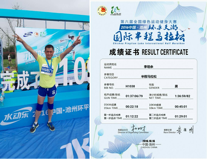 公司职工李培余在日前举行的2016中国·池州环平天湖国际半程马拉松比赛活动中,以1:36:59秒的成绩跑完21.0975km赛程,在6000多名参赛选手中排名82位,成绩骄人。