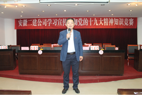 11月7日下午,安徽二建公司在原办公楼三楼会议室举办了“学习宣传贯彻党的十九大精神知识竞赛”活动。来自所属各党支部共计11支代表队参加了此次比赛。公司党委书记刘贤奇、总工程师邱立龙应邀出席会议,工会主席李林、纪委书记仇多维、女工部主任王俊共同担任本次知识竞赛活动的评委。公司机关各部门负责人,党群部门全体人员,分公司党政主要负责人、团支部书记观看比赛。