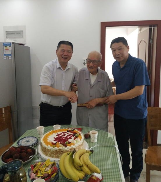6月15日上午,公司党委书记刘贤奇在工会主席李林、后勤综合服务部支部书记、主管离休工作人员的陪同下,来到居住在高新区的离休老干部百岁老人李辉家中,送上生日寿桃蛋糕、慰问金和代表公司党委对老人的生日祝福,祝愿老人寿比南山,福如东海。李辉,男,1919年7月1日出生,江苏盐城人,1945年4月1日参加新四军抗日队伍,1946年4月加入中国共产党,出生入死63载,枪林弹雨,对党忠诚,积极工作,勤勤恳恳,对企业发展建设作出应有贡献。如今老人精神矍铄,生活安逸,心情愉悦。刘贤奇一边与老人真挚地交谈,了解老人的身体健康状况、长寿秘籍;一边与老人分享中国改革开放翻天覆的变化,安徽二建66载的风雨历程,目前企业已走向正常发展轨道,企业正处于转型发展的关键时期,发展前景越来越好,希望老人事事顺心,天天快乐,益寿延年。老人感谢刘书记和离休办同志在自己百岁生日时给予的祝福,感谢公司党委关心呵护,表示要坚定信念,永远听党话,跟党走,祝愿企业再创新的辉煌。