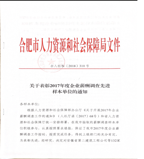 根据人力资源和社会保障部办公厅《关于开展2017年度企业薪酬调查先进样本单位的通知》(人社厅函【2017】68号),我公司领导高度重视,按照通知要求精心组织安排人员,以快速高效严谨的工作态度,圆满完成了此次企业薪酬调查工作,得到了上级部门的充分肯定,荣获了“2017年度企业薪酬调查先进样本单位”殊荣。