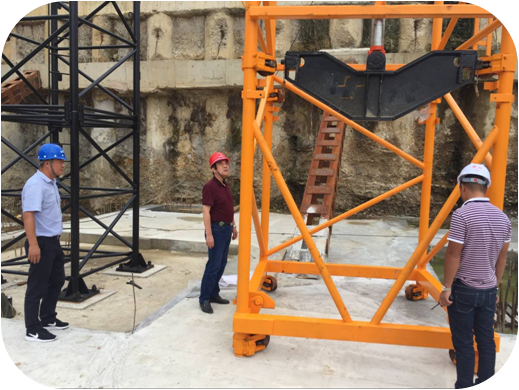 曹建深入现场,从大臂组装、基节、标准节、爬升套架安装等工序一一耐心指导,对现场安装安全及安装质量进行严格把控。在曹总监的正确指挥、大家团结协作下,1#塔吊顺利安装完成。