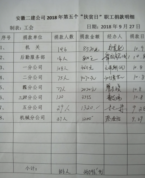 开展全国扶贫日捐款活动距今已是第五个年头,它体现了党中央、国务院对扶贫开发工作的高度重视和对贫困地区群众的关爱。工会每年牵头组织此项活动,公司领导率先垂范、带头捐款,广大职工积极响应,机关、分公司、项目部、一线班组员工纷纷奉献自己的一份爱心。短短几日,全公司上下共有606名职工参与,累计捐款26096元。