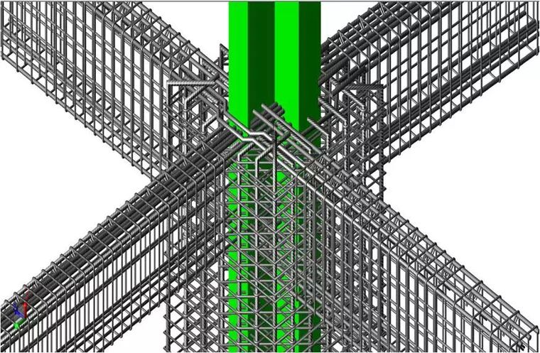 在复杂节点的地方,钢筋的碰撞发挥着重要的作用。在型钢混凝土梁柱节点处,钢筋数量众多,且因为型钢的存在,造成梁的纵向钢筋无法直接拉通。BIM工程师搭建节点模型,对钢筋的排布进行调整,通过绕弯、预留洞口、焊接等方式,避免钢筋与型钢的碰撞。