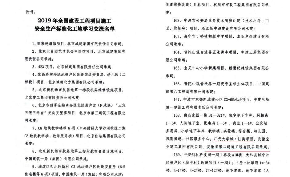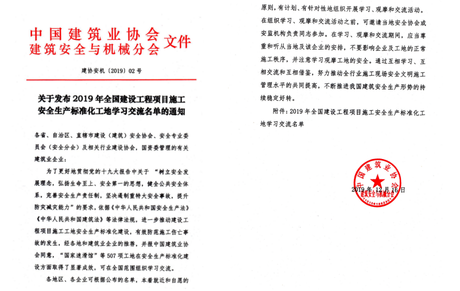 2019年,公司共创建全国建设工程项目施工安全生产标准化工地1个,省级安全生产标准化示范工地8个,市级安全生产标准化示范工地8个,集团公司安全文明标准化示范工地10个,创建项目数量再创历史新高,突破了6年来国家级示范工地及省外项目省级示范工地零的突破。