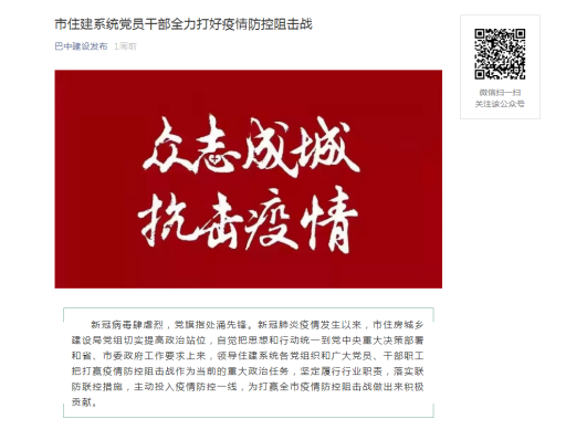 近日,安徽二建四川巴中半山逸城项目一次性通过巴中市安全监督站复工复产验收,正式复工。并通过巴中市住房城乡建设局机关党委书记杨白玉上报,在巴中建设发布(公众号)《市住建系统党员干部全力打好疫情防控狙击站》一文中发表,进行宣传。