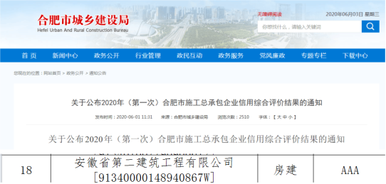 近日,在合肥市城乡建设局网站关于公布2020年(第一次)合肥市施工总承包企业信用综合评价结果的通知中,安徽二建公司在房建专业信用综合评价获得AAA级信用企业,在454家参评企业中总排名第18名,市政专业信用综合评价获得AA级信用企业,在331家参评企业中总排名第27名。此次合肥市施工总承包企业信用综合评价准备工作,由公司市场管理部牵头,相关部门及所属各单位配合,历时一年时间。房建专业AAA级信用企业的获得,有助于公司在合肥市场的公开招投标。