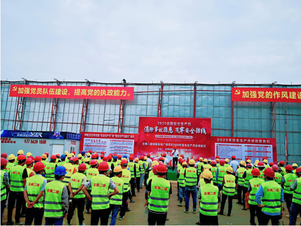 6月1日上午,安徽二建公司举行了“安全生产月”启动仪式,公司领导、机关全体职工100余人参加。总经理陆勤斌作了讲话,指出安全生产工作的重要性和“安全生产月”活动的意义,宣布2020年“安全生产月”活动正式启动。全体职工在安全总监曹建的带领下进行了安全宣誓,随后,大家在印有“安全生产月”主题“消除事故隐患,筑牢安全防线”的横幅上签名。公司所属各单位、各项目部同步开展了启动仪式。