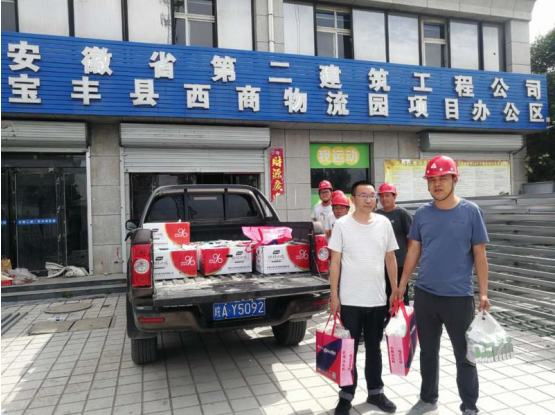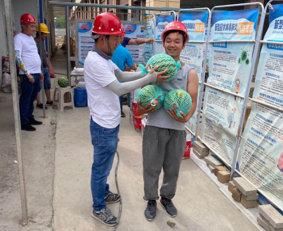 黄盱一行给项目员工送去慰问和关怀,准备了毛巾、风油精、十滴水、西瓜等防暑降温用品,嘱咐大家要合理安排工作时间,在做好工作的同时,加强自身防护。