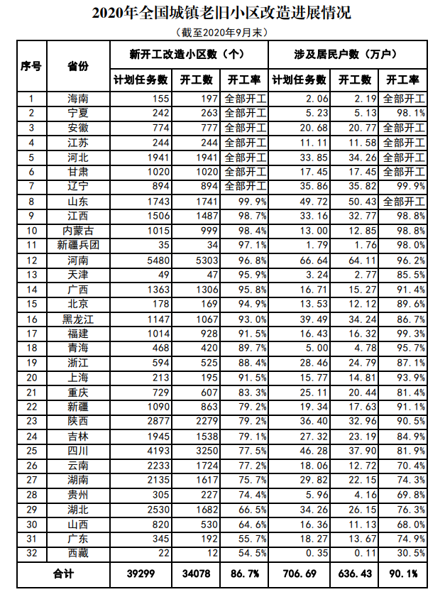 2020年1-9月份全国城镇老旧小区改造进展情况如下