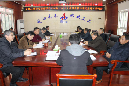 12月11日下午,安徽二建公司召开党委理论学习中心组(扩大)暨四季度党群工作会,公司领导班子、党委工作部、纪检监察室、工会、团委、信访保卫部、人力资源部主要负责人,所属各党支部书记参加。会议由党委副书记、纪委书记仇多维主持。