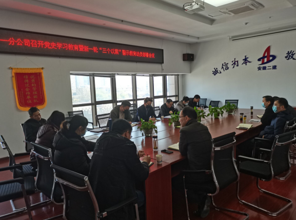 会上学习《安徽二建公司党委关于开展党史学习教育的工作方案》、《关于印发安徽二建党委关于开展新一轮深化“三个以案”警示教育的工作方案的通知》,对党史学习及新一轮“三个以案”警示教育进行部署,要求与会人员能在历史中汲取精神力量,为实现“中国梦”注入无限生机和活力;能在历史教育中坚定信念与信仰,引领发展中不迷失方向。