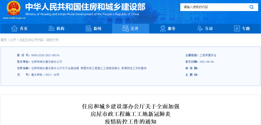 为坚决贯彻落实党中央、国务院关于新冠肺炎疫情防控的部署要求,持续深入做好房屋市政工程施工工地(以下简称“施工工地”)疫情防控工作,切实保障建筑施工领域从业人员身体健康和生命安全,住房和城乡建设部办公厅日前印发通知,要求全面加强施工工地疫情防控工作。