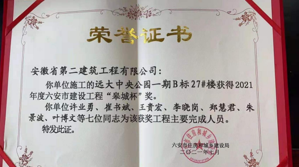 近期,六安市住房和城乡建设局公布了2021年度六安市建设工程“皋城杯”获奖项目名单,其中由安徽二建公司承建的舒城远大项目获此奖项。