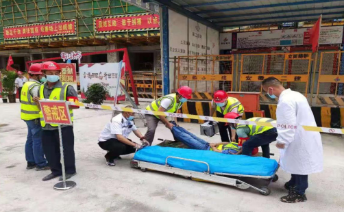 各救援小组准备就位开始演练,现场演练共分为车辆引导组、警戒组、通讯组、救援组、医疗组。第一个演练科目为:消防应急救援。各应急救援小组根据《消防应急预案》决定按程序启动消防应急预案,应对出现的突发险情,各小组按照演练方案,从发现火情、立即启动应急预案、接警救援到完成火源扑灭、人员受伤救援。第二个演练科目为:防高处坠落。模拟人员发生坠落意外后,项目医疗组及时赶到现场救治并拨打120急救电话。第三个演练科目为:触电事故。模拟一工人操作失误引发触电,各小组立即赶往现场,对伤者进行抢救并送至医院救治。最后一个演练科目为:疫情防控。模拟事故现场发现疫情疑似患者的应急处置流程。