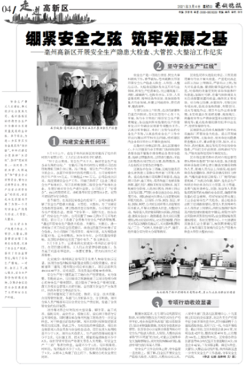 年后复工不久,亳州市高新区即对辖区内的施工单位进行逐个复工复产以及安全生产隐患大检查、大管控、大整治。3月3日上午,亳州市高新区建管主任、第五管理中心主任、环保中心主任等领导以及亳州市记者来到亳州滨江壹号项目进行实地现场检查,并采访了项目经理朱晓亮。在听取项目汇报、查阅安全管控资料后,当地各主管部门领导充分肯定了项目在现场安全、环保管控等方面的有力举措,并在亳州晚报上刊登了项目全方位的安全管理体系。