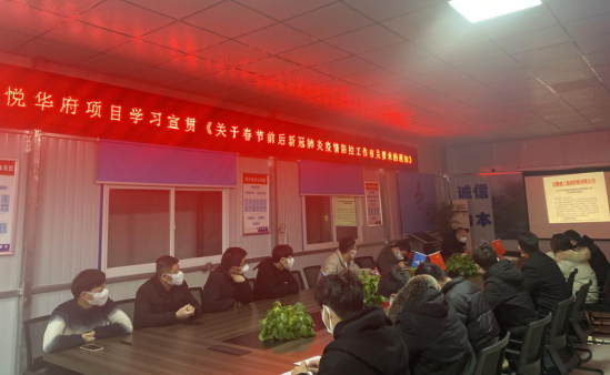 近日,铜陵吾悦华府项目组织学习【关于切实做好2021年“两节”期间新冠肺炎疫情防控工作的通知】和【关于春节前后新冠肺炎疫情防控工作有关要求的通知】,根据文件精神安排部署春节前后新冠肺炎疫情防控工作,做到早安排早准备,确保本项目在春节前后无疫情发生。