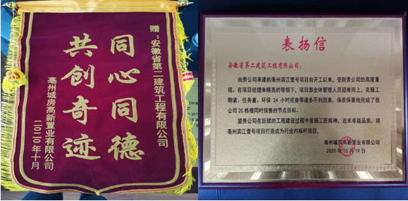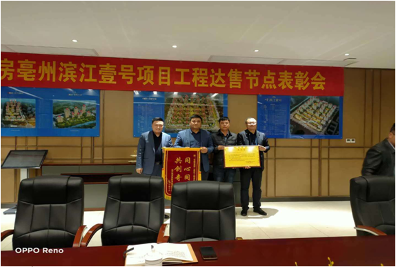 北京城房亳州公司真挚邀请四分公司及项目机关人员参加滨江壹号项目预售表彰会,北京城房对二建公司的努力与付出表示肯定与认可,并颁发锦旗与表扬信。
