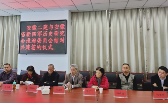 2020年10月26日下午,安徽省新四军历史研究会淮海委员会会长张振山,副会长徐宁宁、彭小萍、张华明、杨承愉、李茂辉以及秘书长高立共7人莅临安徽二建四分公司开展结对共建签约仪式。