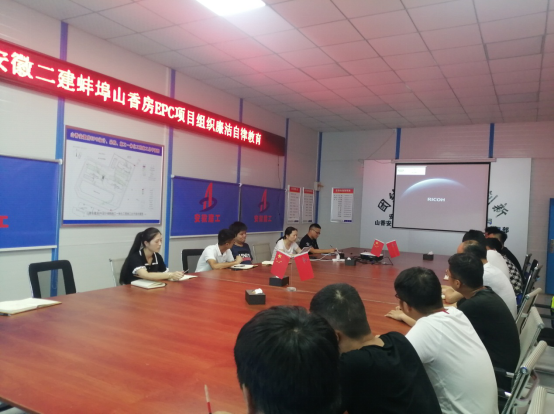 8月11日中午,一分公司党支部书记倪海霞在蚌埠山香安置房EPC项目部开展廉洁从业教育,强调作风建设的重要性,组织全体职工学习《工程建设领域廉洁风险防控清单》。