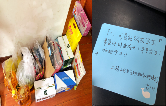 时隔三年,二分公司工会心系祖孙二人的生活状况,了解到目前他们已被我公司职工接来合肥,老人租房带着孙子在省二建幼儿园上学。志愿服务队了解到具体需求后,即刻在分公司范围内组织了捐款和捐赠物资的扶贫帮困志愿服务活动,二分公司职工积极响应,踊跃捐赠,短短几天时间募得慰问金4100元以及米面粮油、牛奶酸奶、水果、儿童图书、玩具、老人及孩子的衣物鞋子等生活物品。2020年5月29日上午,二分公司工会主席黄业云带领三支志愿服务队代表前往老人家里看望老人及孩子。服务队将大家捐献的慰问金和生活物品一并交给了他们,希望能让他们的生活过得好一点,能够感受到二建大家庭的温暖。交谈中,老人质朴的脸颊上始终带着微笑,身旁的孙子也是乖巧懂事,非常有礼貌,一直开心地说着“谢谢叔叔阿姨!”