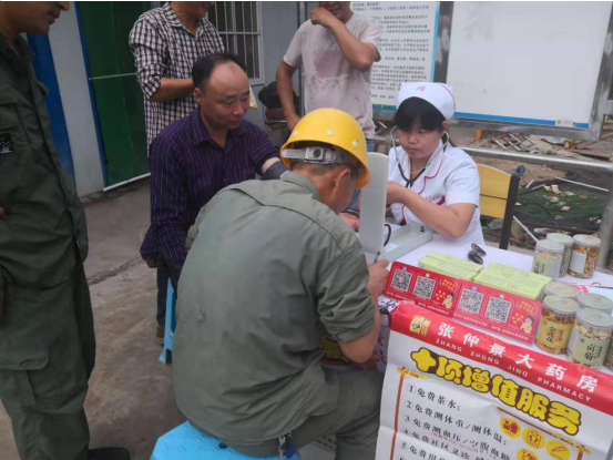 随着人们的生活水平的不断提高,饮食结构发生变化,高血压等心脑血管疾病的患病率逐年上升,对职工健康构成了较大威胁,同时也不利于企业安全稳定健康发展。据了解,河南宝丰项目工人年龄普遍在四、五十岁左右,正是心脑血管疾病和高血压高发年龄段。因此,本次项目党支部携手张仲景大药房开展义诊,为一线工人义务测量血压并及时给予健康指导和咨询,让职工通过了解自己的血压数值,对疾病早预防、早治疗。