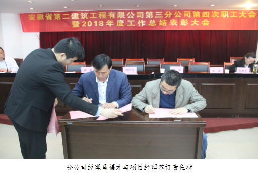 在分公司职工大会上,分公司经理马福才与参赛的各项目经理签订了劳动竞赛责任状。其中阜阳吾悦广场项目为新城控股开发,是分公司首次与上市地产公司合作,工期紧、任务重,项目经理表示一定会不折不扣的完成劳动竞赛责任状的内容,做到比、学、赶、帮、超,塑造二建良好形象。其他项目经理也一致表示会认真贯彻职代会精神,积极响应劳动竞赛号召,为完成公司年度指标添砖加瓦,为党的98岁华诞送上一份生日祝福。