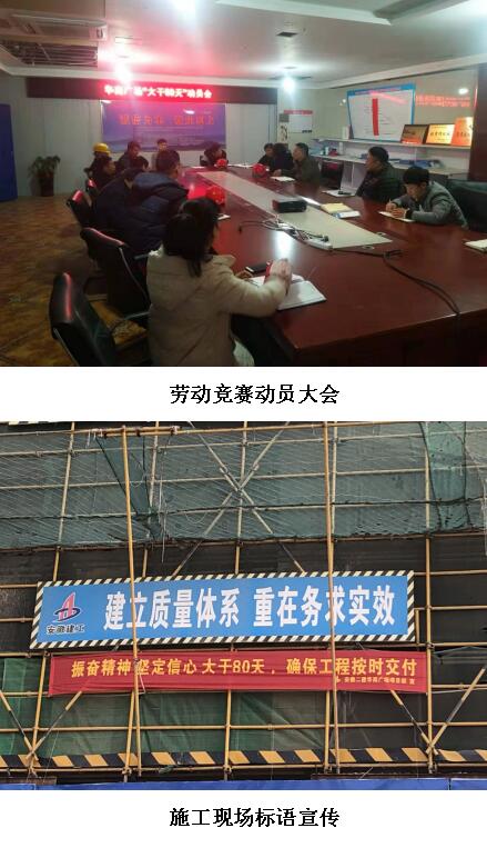 随后,召开了劳动竞赛动员大会,以会议的形式强调参赛班组抢工内容,为顺利完成施工任务提供有力保障。并与施工班组签订了目标责任状,明确了活动目标、意义、要求、奖罚标准。