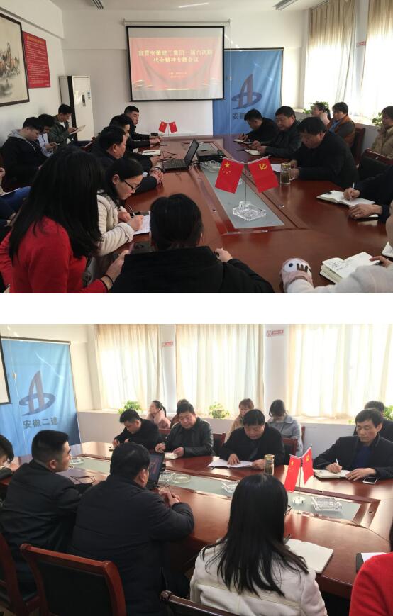 会上学习了安徽建工集团党委书记、董事长赵时运和党委副书记、总经理刘家静在职代会上的讲话及报告,《讲话》和《报告》高度概括了集团公司2018年取得的显著成绩,科学研判了当前面临的形势和任务。赵时运在《讲话》中指出:一是要提高政治站位,坚定打造一流安徽建工的信心决心;二是把握战略机遇,推动高质量发展,实现新提升新突破;三是聚焦根本保证,加强党的领导,提升党建科学化水平。此外,《报告》中也明确了2019年八项重点工作,分别是扭住经营龙头,坚持围绕主业,深化改革成果,夯实基础管理,坚持创新驱动,巩固既有成果,从严管党治党,坚持以人为本。