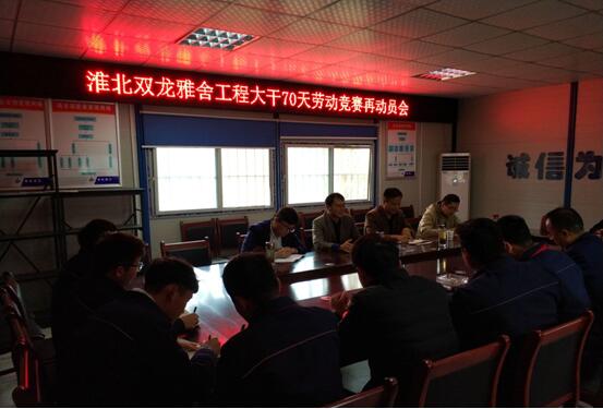 自十月初公司开展“大干70天”劳动竞赛活动以来,淮北双龙雅舍项目在项目经理卢因东的带领下积极响应公司号召,合理安排工作计划,精心组织施工部署,全面掀起大干热潮。会上,崔书斌经理要求项目部继续保持高昂的工作热情,倒排施工计划,抓住关键节点。蒯家江宣贯了公司劳动竞赛活动精神,指示项目部落实 “比、学、赶、帮、超”活动方式,提高认识,端正态度。强调年轻管理人员要加强自身学习,提高工作执行力,养成良好的工作习惯;同时也要有面对挫折的勇气,做到干一行爱一行,同心协力为二建的发展贡献一份力量。