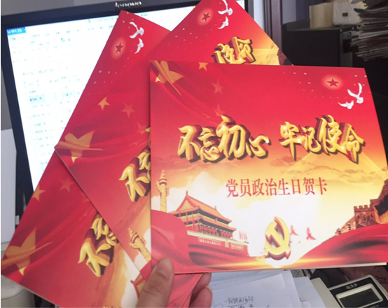 支部书记倪海霞为在三季度入党的三位党员统一过政治生日并发放生日贺卡。通过重温入党誓词、重忆入党志愿,进一步提高分公司党员队伍整体素质,让广大党员通过常思“当初入党为什么、如今为党做什么、今后为党留什么”明确党员使命,增强党性意识。