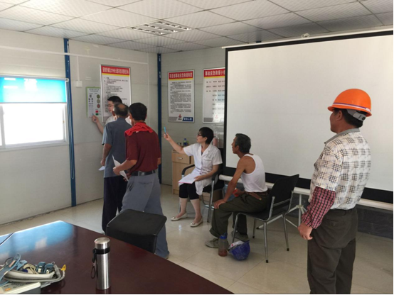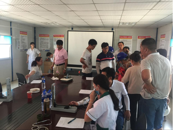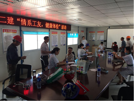 在会议室,工人们有序地排队进行各项检查,并不时提出各种健康疑问,医生耐心的解答并指出夏季作业的注意事项。随后,体检结果由项目管理人员分发到工人手里,活动顺利结束。