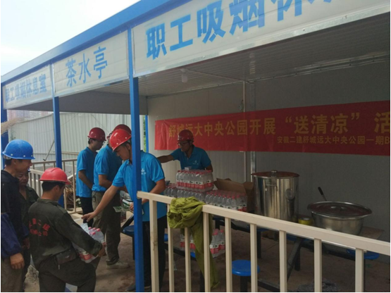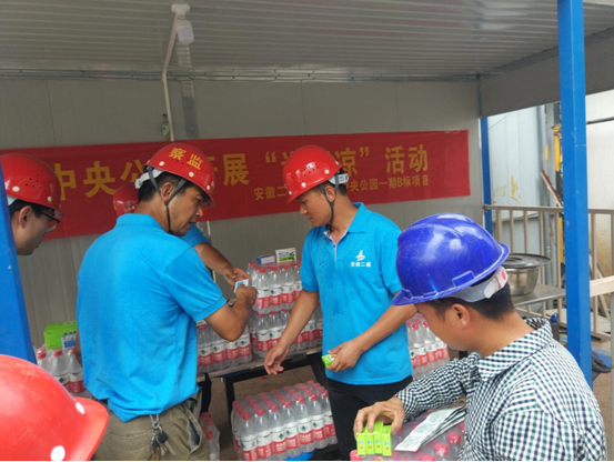 连日来气温居高不下,舒城远大中央公园项目部于6月27日下午在施工现场开展了为工友“送清凉”活动,表达了项目部对奋战在高温酷暑下员工的关怀与慰问。