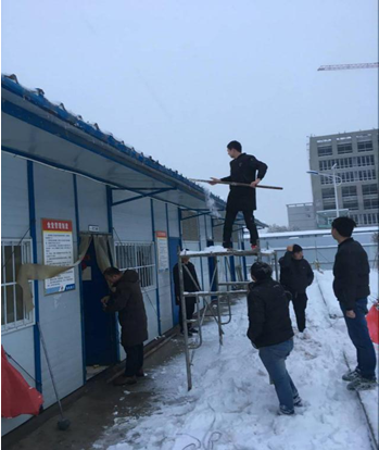 纷纷扬扬的雪下了一夜,整个工地银装素裹,美丽的雪景却给施工生产和出行带来了不便。1月6日上午,太和发艺时尚文化园项目经理蒯声文组织项目全体职工进行扫雪活动。