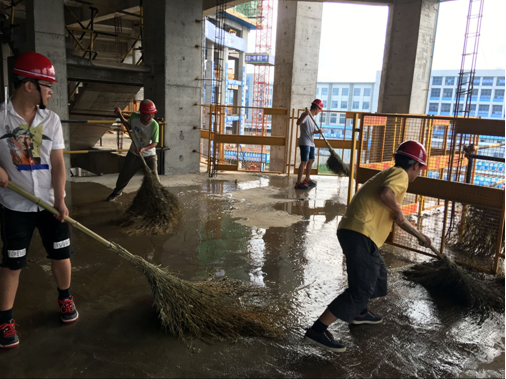 团员青年利用傍晚高温天气减弱时段,使用大扫帚、洒水管、拖把、防尘布等物品,在工地安全入口、楼层内、施工环形路上进行除尘行动,每一名青年团员满怀热情,积极响应,你洒水我拖地,你接水管我盖布,干劲十足,展现了生物岛一期项目青年团员的良好形象。