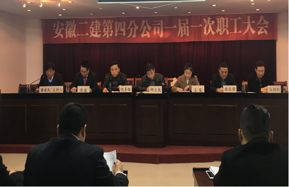 乘风破浪推发展,勠力同行齐奋进。为加快转型升级步伐,优化内部管理机制,客观分析当前四分公司面临的形势,认真学习贯彻落实安徽二建公司十五届四次职代会精神,凝心聚力抓好2017年度各项工作,3月20日上午,安徽二建四分公司一届一次职工大会在三楼会议室隆重召开。公司总工程师邱立龙、纪委书记仇多维、女工主任王俊以及四分公司职工近40人参加了会议。
