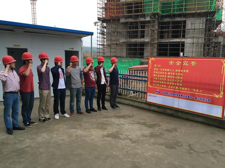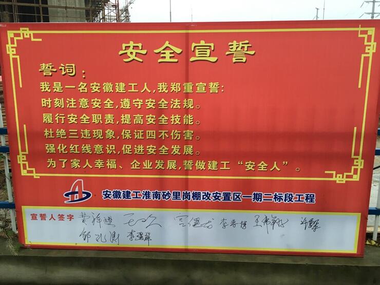 早上六点,清晨第一缕阳光刚刚洒下,项目部管理人员已在安全宣誓牌前排列整齐,面对庄严的宣誓牌,全体成员在项目技术负责人王欢的带领下,右手握拳置于面庞,郑重地齐声宣读誓词:我是一名安徽建工人,我郑重宣誓:时刻注意安全,遵守安全法规;履行安全职责,提高安全技能;杜绝三违现象,保证四不伤害;强化红线意识,促进安全发展;为了家人幸福,企业发展,誓做建工“安全人”。随后,项目部全体成员在项目经理费祥琪的带领下,陆续在宣誓牌上签下了自己的名字,表明自己时刻谨记安全宣誓内容,坚持安全生产的决心。