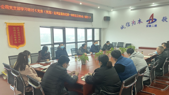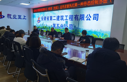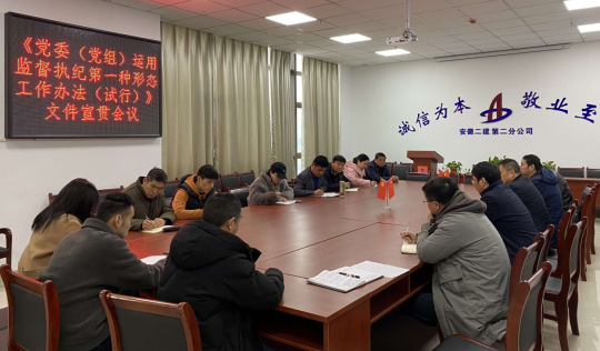 近期,为认真落实全面从严治党主体责任和监督责任,践行“四种形态”,强化“第一种形态”运用。安徽二建公司所属各单位组织学习了《党委(党组)运用监督执纪第一种形态工作办法(试行)》。