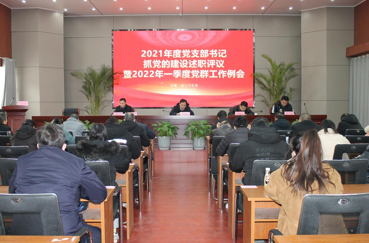 2月21日下午,安徽二建公司在新会议室召开2021年度基层党支部书记抓党的建设述职评议暨2022年一季度党群工作例会。公司党委书记、董事长许业勇,党委副书记、总经理李建成,党委副书记、工会主席王军,党委委员、纪委书记沈壮出席会议,公司党群部门人员、所属各单位党支部书记、团支部书记、综合办负责党务工作人员参会?;嵋橛赏蹙鞒?。