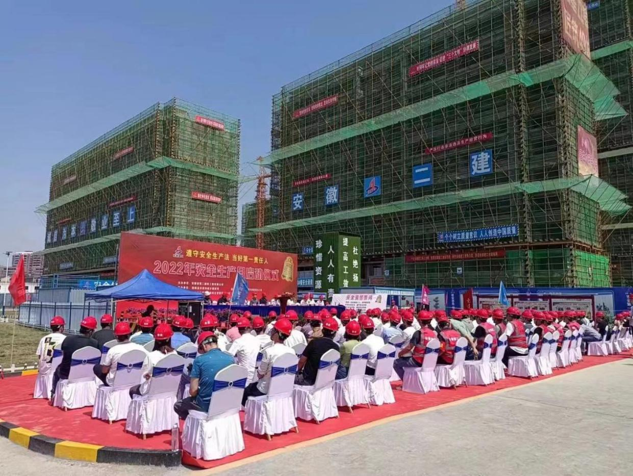 6月18日,安徽二建在固镇鼎元名邸项目、蚌埠紫金云城项目举办2022年安全生产月活动启动仪式暨现场观摩交流活动。固镇县住房和城乡建设局局长刘安、应急管理局局长宋洪涛等主管单位代表,蚌埠拓基房地产开发有限责任公司总经理何世华等业主方代表,安徽二建公司党委副书记、总经理李建成,副总经理叶和永,副总经理、总工程师费勤波等参加活动,活动由叶和永主持。