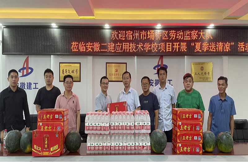 烈日炎炎,酷暑难当,为确保一线工人身心健康,督促做好夏季高温期间安全生产工作,7月15日上午,宿州埇桥区劳动监察大队党支部书记、副大队长王建一行赴安徽二建宿州应用技术学校项目开展“夏季送清凉”活动,为奋战在高温下的建筑工人送来了真挚的问候和关怀。