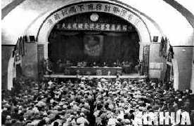 4月23日,在延安杨家岭中央大礼堂,七大开幕式的主席台上,悬挂着毛泽东和朱德的巨幅画像,鲜艳的党旗挂在两边。会场后面的墙上,挂着“同心同德”四个大字。两侧墙上张贴着“坚持真理”“修正错误”等标语,靠墙边插着24面红旗,象征着中国共产党24年奋斗的历程。插红旗的“V”字形木座是革命胜利的标志。在主席台的正上方,悬挂着一条引人注目的横幅:“在毛泽东的旗帜下胜利前进!”